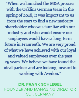 Oaklins’ team in Germany, supported by Oaklins’ industry specialists from around the world, acted as the exclusive M&A advisor to the shareholders of SLF on the sale of the business, and structured a competitive process with the participation of international trade and financial buyers. The team had built a detailed understanding of the business and a trusting relationship with the SLF founders over the two years prior to the sale in January 2019.