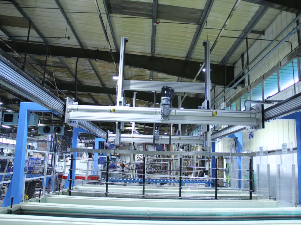 The Z-axis moves at 0.5 m/s with a stroke length of 1.5 metres to raise and lower the slides into the dipping tank. Two heads are utilised to provide stability manoeuvring the 4 metre lengths; a challenging shape and size. The time spent in the tank varies from 30 seconds to 240 seconds, depending on the individual tank. Between each chemical tank, the slides are submerged in a clear water rinse tank to rinse the slides off and to prevent cross contamination of the chemicals in the process.