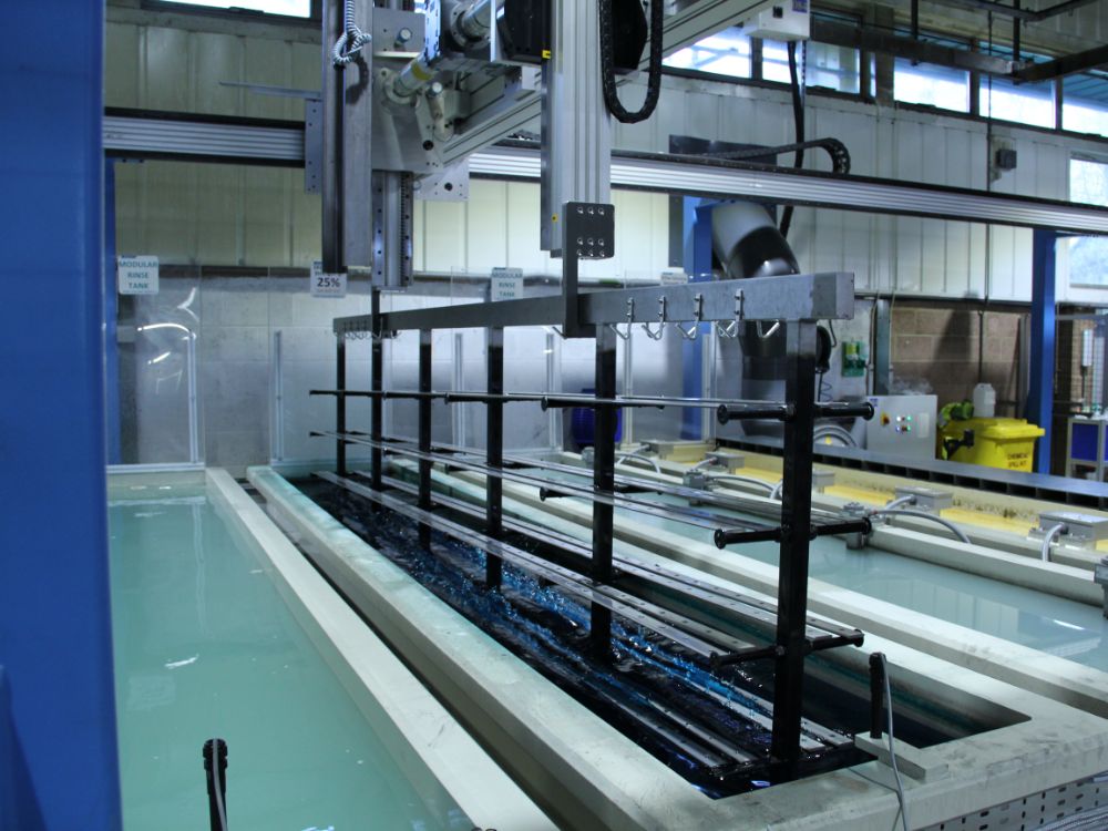 Linear motion expert HepcoMotion has recently upgraded its core blacking process system with the use of its own HDS2 rack driven gantry system to dip its slides, rings and track system into a multi-station chemical finishing dipping plant. The blacking process changes the colour of metal items to black, which improves the visual appearance, providing uniformity and consistency. The blacking process is a key part of Hepco’s manufacturing process with all products apart from stainless steel or special orders being blackened.