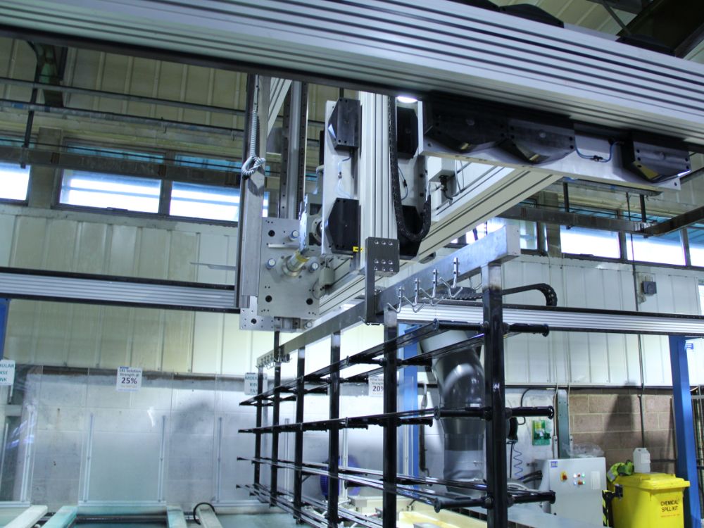 The previous linear system used by HepcoMotion worked by sending the slides on conveyors, with the chemicals sprayed onto the slides as they passed through different spray booths. The biggest problem with this system was the quality and inconsistency, as the surfaces of the finished slides were not consistently covered in the black colour. Moreover, a minimum of three people were required to operate the old system, whereas the new automated system requires only one person, resulting in a significant reduction in labour. Processing 0.9 metres of narrow section slide every minute, the new gantry system has improved both the quality and consistency of the finished product as well as reducing the number of operators needed.