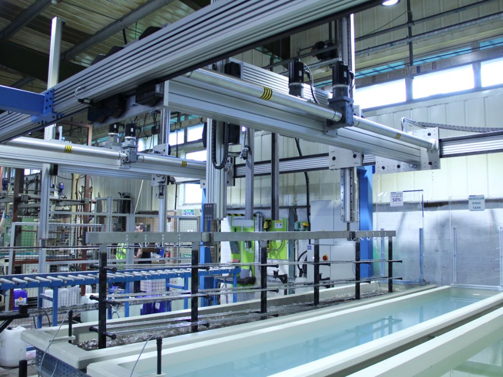Linear motion expert HepcoMotion has recently upgraded its core blacking process system with the use of its own HDS2 rack driven gantry system to dip its slides, rings and track system into a multi-station chemical finishing dipping plant. The blacking process changes the colour of metal items to black, which improves the visual appearance, providing uniformity and consistency. The blacking process is a key part of Hepco’s manufacturing process with all products apart from stainless steel or special orders being blackened.