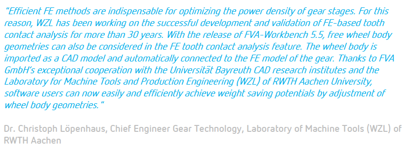 In addition to planet carriers and gearbox casings, wheel bodies can now also be imported in many common CAD formats. First, the wheel body is automatically adapted to the FEM mesh of the gear. The FEM meshing as well as positioning and connection to the gear model are then performed in just a few seconds. Automation, interactive user navigation, and user-friendly assistants make these steps extremely simple.