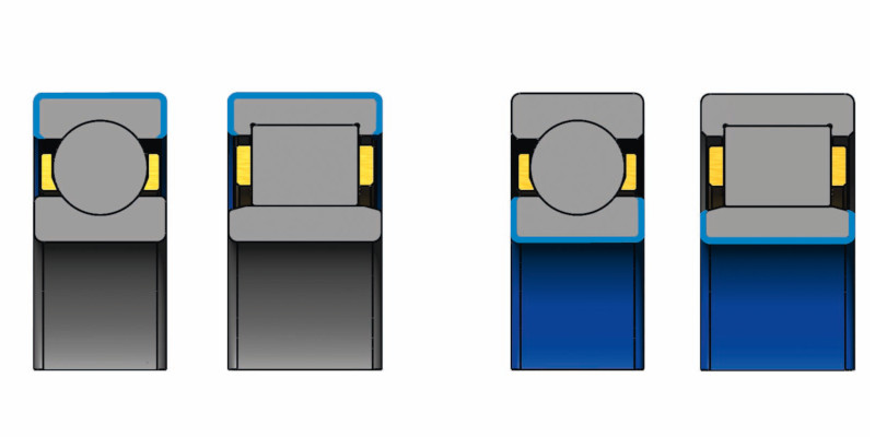 Figs. 2a and 2b: For electrically insulated bearings from NKE, the insulating layer is applied to the outer ring (SQ77 or SQ77C – Fig. 2a) or the inner ring (SQ77E or SQ77H – Fig. 2b) by plasma-spraying, a thin-film technology