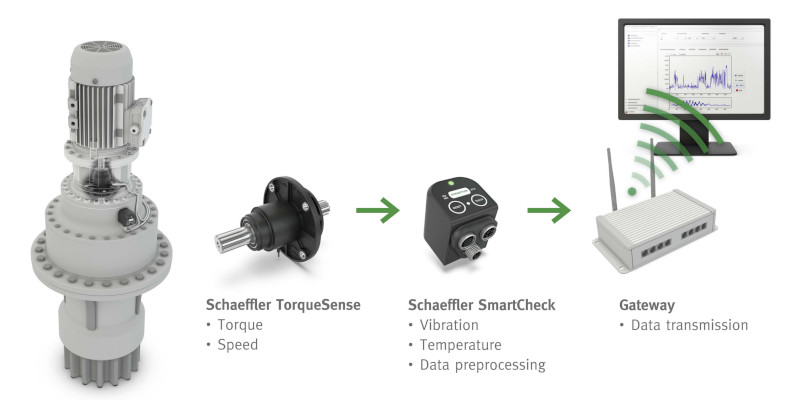 The Schaeffler SmartCheck performs frequency-selective condition monitoring of bearings, gearboxes, electric motors, pumps, fans and machines based on solid-borne vibrations. Conspicuous frequencies can be automatically attributed to the damaged component using only one Schaeffler SmartCheck. A temperature sensor is also integrated into the device. The torque signal and speed signal of the Schaeffler TorqueSense are sent, pre-processed and supplied to the machine control system and/or maintenance department with the vibration signals that are also analysed via the SmartCheck. The addition of operating data on torque and speed to the SmartCheck condition monitoring system opens up several new scenarios. In the simplest case, the system allows the monitoring of torque peaks and their frequency and therefore an evaluation of the utilisation level and the derivation of load-based maintenance measures. The signals can also be integrated into the operating strategy for drives and initiate torque limitation or shutdown functions.