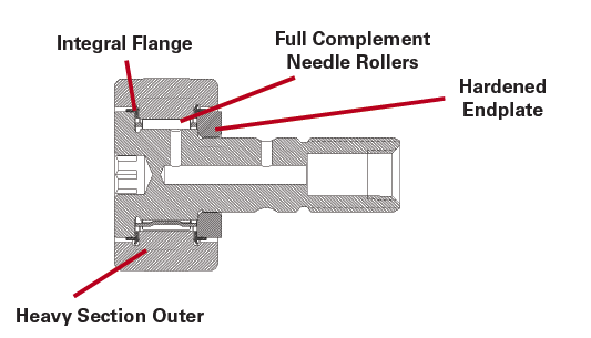 - Heavy section outer helps support radial loading and provide proper rolling elements.