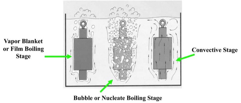 Thermal conductivity of the steel component, viscosity of the quenchant, chemical nature of the quenchant, temperature of the bath, agitation levels of the bath and a host of other factors affect the overall heat transfer rate. Of significant importance is the fact that the heat transfer mechanism in the quenchant can be distinctly different at different temperatures, giving rise to three important phenomena called (a) the vapor blanket (b) nucleate boiling and (c) convective phases.