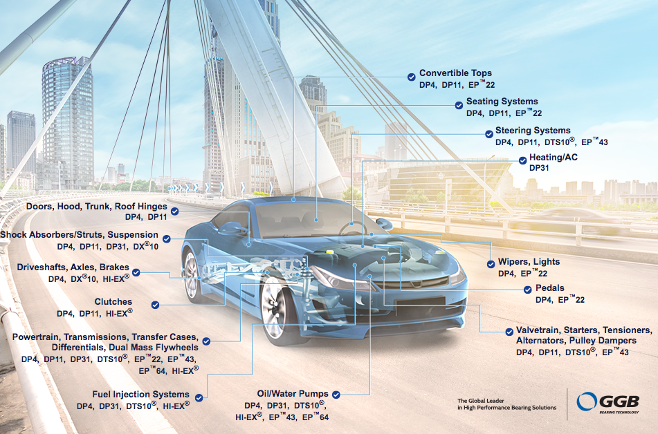 Many features that contribute to the safety and comfort of the modern vehicle rely on selecting the ideal automotive bearings to meet strict criteria for the design, function and performance of the application. GGB provides more than 50 auto bearing solutions for automotive applications.