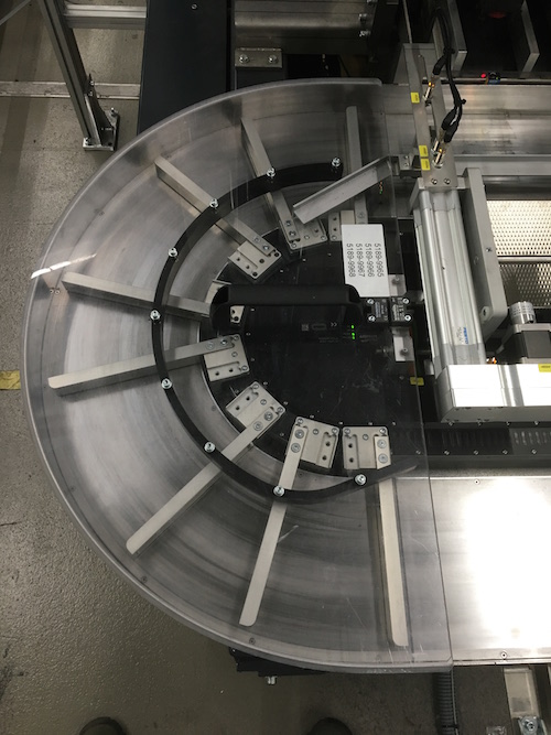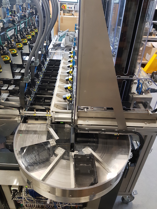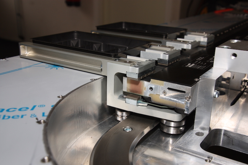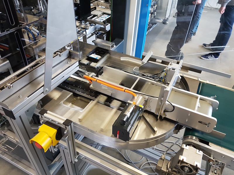 The total length of the XTS system in the machine is 5m, on which a total of 32 movers travel. Hepco’s 1-Trak system comprises of two straight linear V-guides and two clothoid-shaped end segments. Unusually for this construction, the trays are not directly mounted to the movers, but are supported by the base plate and pushed from position to position by a series of pushers mounted on each mover.