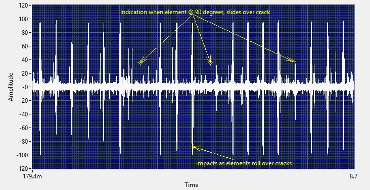 The spectrum analysis of this oven motor bearing shows clearly where the roller at 90 degrees hits the crack as the knock stops briefly. Thus, the sound pattern indicates already an existing problem, being the most reliable source of information when determining the condition of a slow-speed bearing using ultrasound.