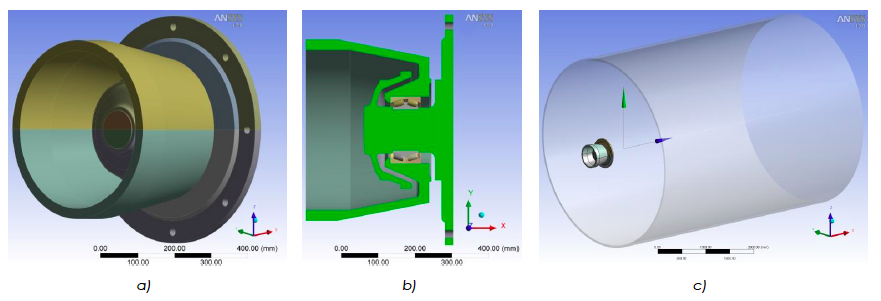 Fig. 7 – Concrete mixer gearbox geometry preparation: a) studied assembly; b) assembly section; c) drum simplified model (beam structure)