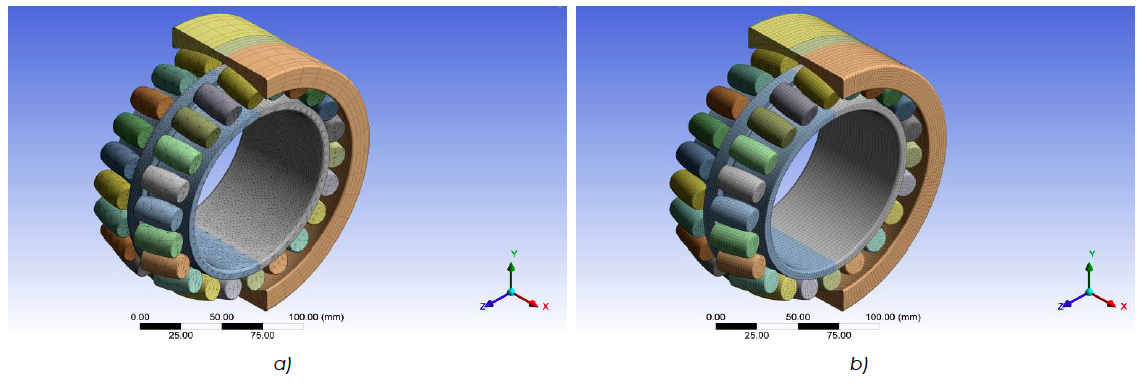 To prepare and optimize the model for the meshing process, the bearing geometry has been previously sliced in many regions in the Ansys Design Modeler module. All the model components have been meshed as deformable bodies, except for the cages which have been considered rigid bodies. For each deformable body, different 3D elements have been assigned, while in the contact areas of the rigid bodies only 2D elements have been used. The imposed 3D structural elements are the 2-node beam element for the drum and the 20-node brick element for all the remaining deformable bodies. The assigned 2D structural element is represented by the 8-node quadrilateral shape element. Due to the complexity of the model geometry, other degenerated meshing elements have been used such as: 10-node tetrahedron, 13-node pyramid, 15-node wedge, and 6-node triangle elements.