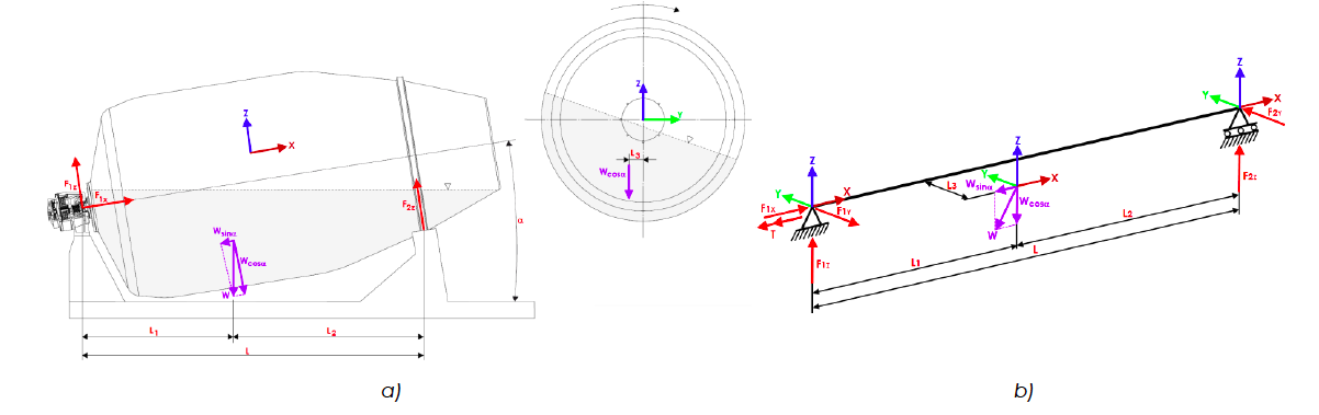 In Fig. 11 a, the application point of the total load is out of the drum median plane and for a better understanding two views in different planes are given (Z-X and Z-Y planes). Due to the fact that the drum axis of rotation is inclined with  angle, with respect to horizontal axis, the total load affects the structure also with an axial component, taken entirely by the hinged support. The total load (W) has been projected, on the Z-X plane, along Z and X directions taking into account the inclination angle of the drum. The resulting components produce reactions called F1x, F1z on the hinged support and F2z on the roller support.