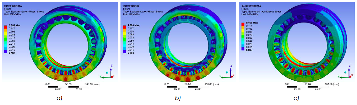 Fig. 16 – Von Mises equivalent stress distribution of inner ring for: a) 24122 WOR82A; b) 24122 WOR82; c) 24122 WOR82AA