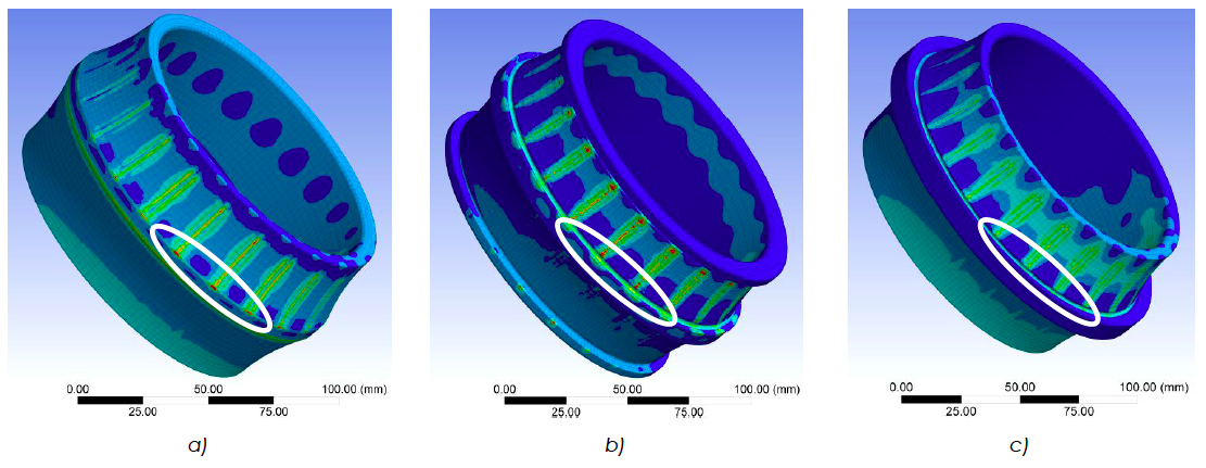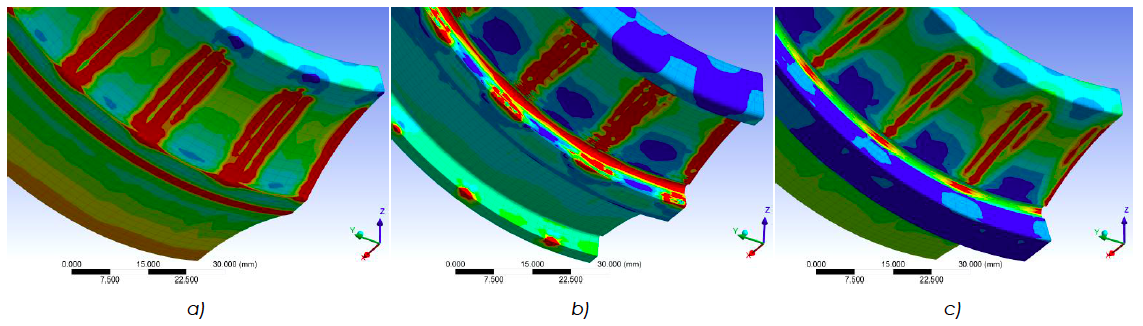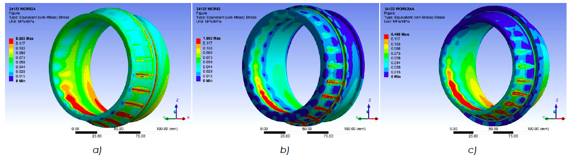 Fig. 17 – Von Mises equivalent stress distribution of inner ring rib for: a) 24122 WOR82A; b) 24122 WOR82; c) 24122 WOR82AA
