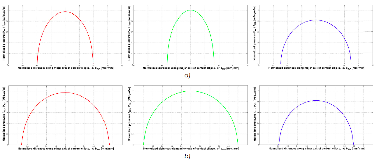Furthermore, the maximum normalized values of contact areas (major and minor axis of the contact ellipse) and contact pressures are represented in 2D and 3D graphics (Fig. 19). Analyzing the graphics of the major and minor axis of ellipse contact area of 24122 WOR82 and 24122 WOR82AA designs, a significant difference in terms of values and shape can be noticed. This fact can be considered as an effect of the applied normal load magnitude, different radius curvature of inner ring raceway and geometry of rollers.