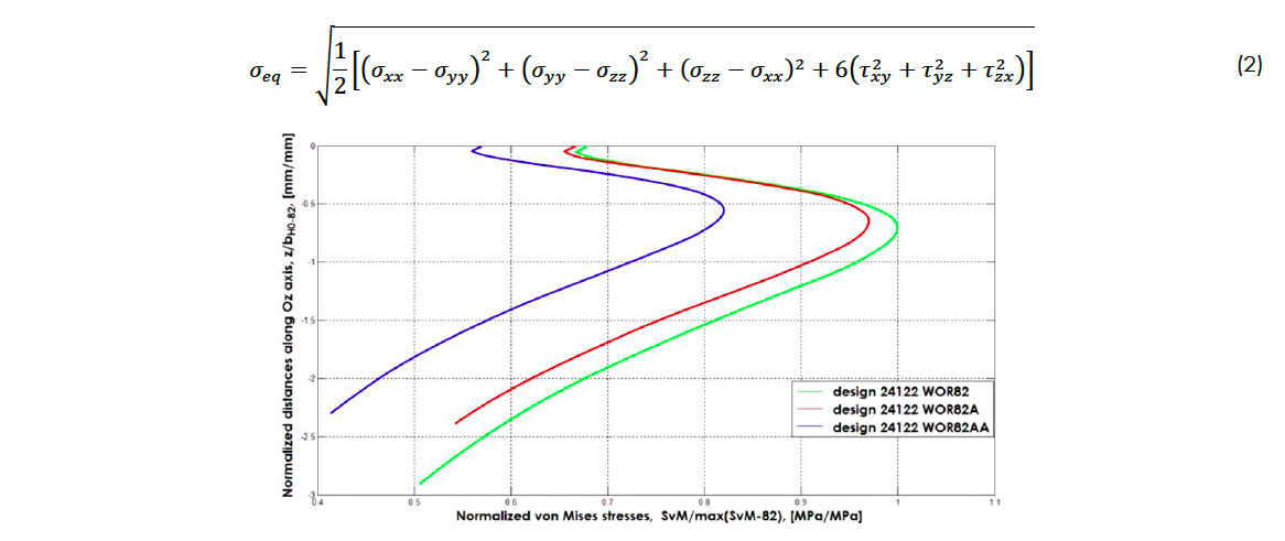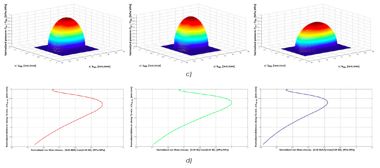 Having the pressure distribution values on the contact area of the most loaded row of rollers, the NON-HERTZ software has been further involved in obtaining the depth distributions, inside the shallow layer, of all six components of the stress tensor and finally the depth distribution of von Mises equivalent stresses of all three inner ring designs (Fig. 20 d). The components of the stress tensor, induced by the entire pressure over the contact area, in a generic point M(x, y, z) are obtained by superposition and using the convolution products: