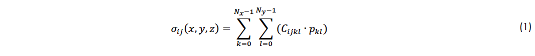 where the influence function Cijkl(x, y, z) describes the stress component ij(x, y, z) due to a unit pressure acting in patch (k, l). This is a Neumann type problem of the elastic half-space theory. Based on stress tensor components the von Mises equivalent stress can be obtained using its definition: