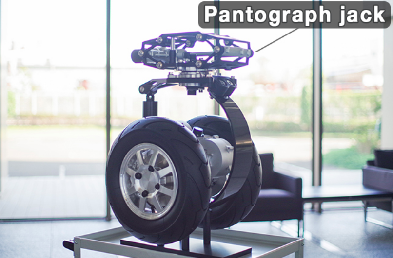 Ryuho Let me tell you how it’s put together. First, the in-wheel motors that drive the two wheels and the brakes are integrated at the bottom. On top of that, there are carbon fiber plate springs and dampers to absorb shock, and a pantograph jack, which adjusts vehicle height, is fitted at the very top. The pantograph jack has a ball screw actuator. The turn of the screws lengthens or shortens the actuator, allowing vehicle height to be adjusted.