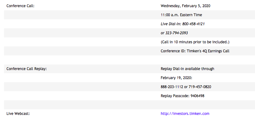 Timken will host a conference call today at 11 a.m. Eastern Time to review its financial results. Presentation materials will be available online in advance of the call for interested investors and securities analysts.