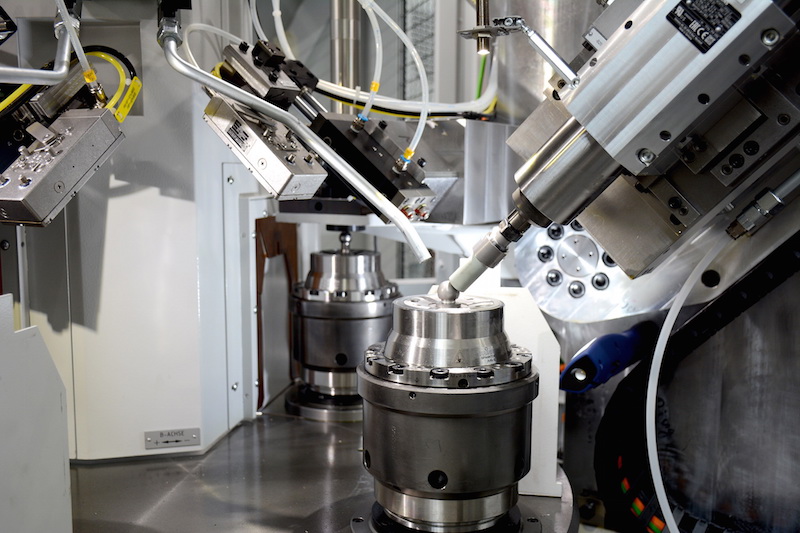 The SpheroStar has two tool spindle slides that can automatically rotate to 90 degrees so that the optimal machining position for the chosen process is set up automatically or by the push of a button, thus enabling the production of flat surfaces as well – with optional cross slides – instead of only spherical surfaces. The units are mounted vertically and are easily accessible for fast changeover. The machine is loaded at the first station by a handling robot parallel to the machining cycle and later again unloaded while the other stations are machining. The indexing table then moves to station 2 where the workpiece is aligned axially. Pre-finishing is in-process gauging controlled in station 3 under size-controlled conditions, and the end-finishing with a flexible stone is done in station 4. This operation is in-process gauging controlled too. A MicroSens force sensor is used for both work steps with workpiece contact detection and stone wear compensation.