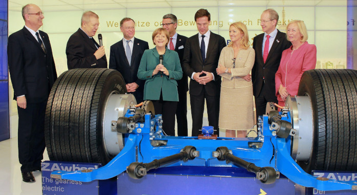 Uwe Ziehl (second from left) explained 2014 in Hannover German chancellor Angela Merkel (fourth from left) an external rotor motor.