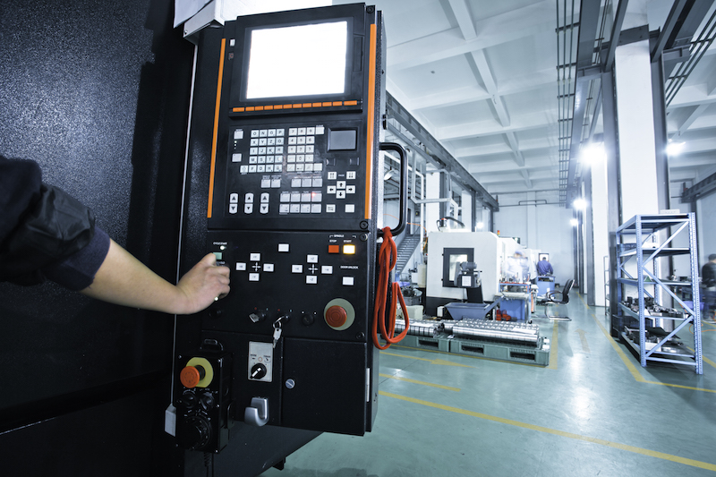 workers operating the controls of a CNC machine that manufactures parts for the aerospace Industry.