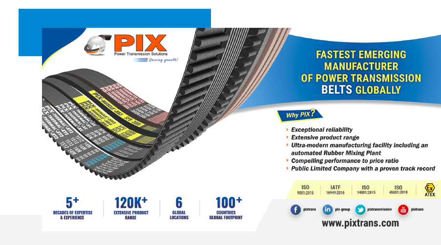 PIX Transmissions Ltd. is amongst the most reliable manufacturers in the global Mechanical Power Transmission industry with an extensive range of high-performance V-Belts, Timing Belts, and Poly-V Belts to suit a wide array of Industrial, Agricultural, Automotive, and Recreational applications. This IATF 16949 certified, public limited company features state-of-the-art Belt manufacturing units as well as an ultra-sophisticated, automated Rubber Mixing facility.