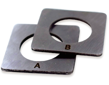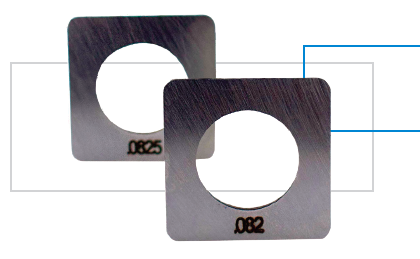 Made from stamped steels that are designed for extreme duty applications, spacers can be nearly any shape from a simple round washer to more complex geometries to fit any constraint. They are hardened and ground to precise thickness and flatness tolerances. Finally, the spacers are then laser engraved or color coded for easy and error-proof identification.